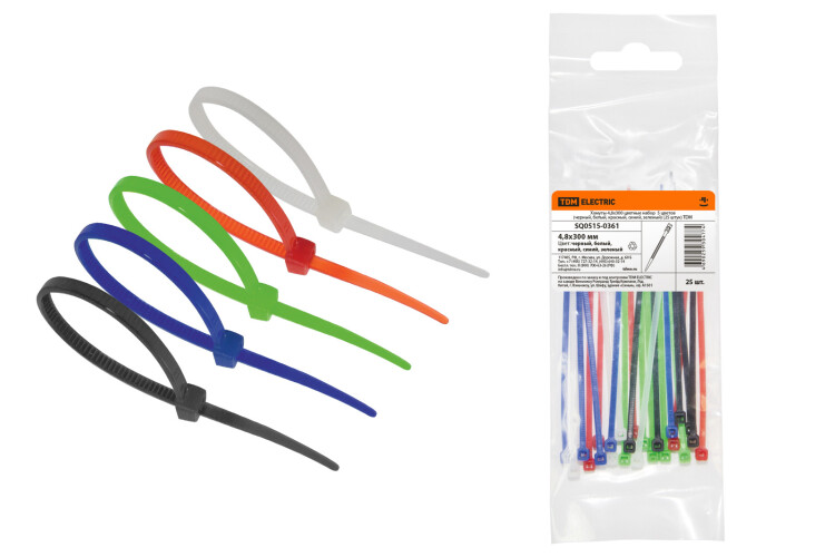 Хомуты 4,8х300 цветные набор 5 цветов (черный, белый, красный, синий, зеленый) (25 штук) TDM (кр.20упак)