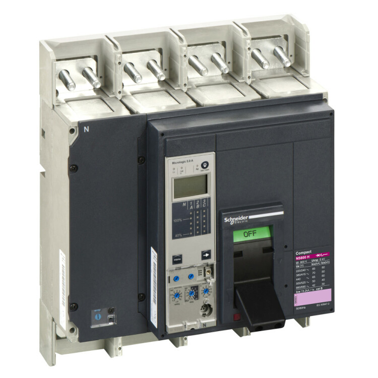 Выключатель-разъединитель Compact NS800H Schneider Electric, 4-полюсный, номинальный ток 800 А, Icu = 70 kA при 380/415 В - с блоком управления Micrologic 5.0A - с ручным управлением - исполнение – стационарный - переднее присоединение - монтаж - на панели.Аппараты ComPact NS предназначены для защиты распределительных сетей напряжением до 690 В пер. тока.Обеспечивают защиту от перегрузки и короткого замыкания.