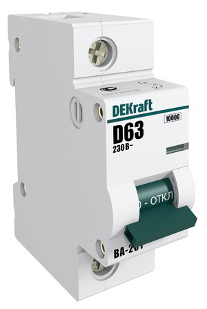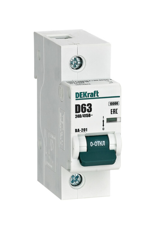 Автоматический выключатель серии ВА-201 DEKraft; 1P; номинальный ток 63 А; характеристика D; отключающая способность 10 кА; ширина модуля 27мм. Монолитная лицевая панель обеспечивает безопасную эксплуатацию аппарата. Окошко-индикатор всегда показывает состояние аппарата вне зависимости от положения рукоятки управления. Двухпозиционная защелка облегчает монтаж выключателя. Аппарат на 100% совместим с корпусами и оболочками DEKraft, Systeme Electric.