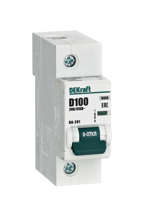 Автоматический выключатель серии ВА-201 DEKraft; 1P; номинальный ток 100 А; характеристика D; отключающая способность 10 кА; ширина модуля 27мм. Монолитная лицевая панель обеспечивает безопасную эксплуатацию аппарата. Окошко-индикатор всегда показывает состояние аппарата вне зависимости от положения рукоятки управления. Двухпозиционная защелка облегчает монтаж выключателя. Аппарат на 100% совместим с корпусами и оболочками DEKraft, Systeme Electric.