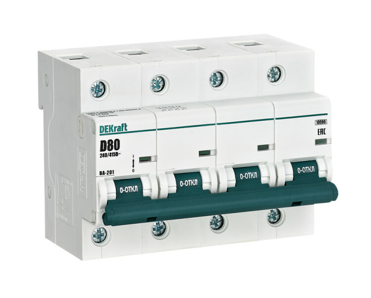Автоматический выключатель серии ВА-201 DEKraft; 4P; номинальный ток 80 А; характеристика D; отключающая способность 10 кА; ширина модуля 27мм. Монолитная лицевая панель обеспечивает безопасную эксплуатацию аппарата. Окошко-индикатор всегда показывает состояние аппарата вне зависимости от положения рукоятки управления. Двухпозиционная защелка облегчает монтаж выключателя. Аппарат на 100% совместим с корпусами и оболочками DEKraft, Systeme Electric.