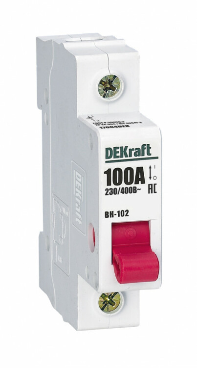 Выключатель-разъединитель серии ВН-102 Dekraft; 1P; номинальный ток 100 А; установка – на DIN-рейку; установочное положение - любое. Выключатели-разъединители применяются для ручного включения/отключения сетей напряжением до 400 В. Специальные мостиковые контакты обеспечивают надежный разрыв цепи; они полностью исключают возможность перекрытия дугой по изоляции. Усиленная рукоятка управления обеспечивает большое количество включений/отключений.