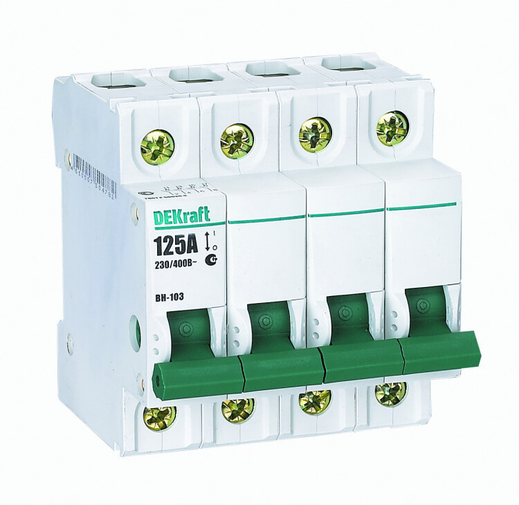 Выключатель-разъединитель серии ВН-103 DEKraft; 4P; номинальный ток 32 А; ширина and ndash; 4 мод. х 18 мм; установка and ndash; на DIN-рейку; установочное положение - любое. Выключатели-разъединители применяются для ручного включения/отключения сетей напряжением до 400 В. Специальные мостиковые контакты обеспечивают надежный разрыв цепи; они полностью исключают возможность перекрытия дугой по изоляции. Усиленная рукоятка управления обеспечивает большое количество включений/отключений.