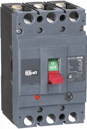 Автоматический выключатель серии ВА-332 DEKraft; 3P; номинальный ток 25 А, отключающая способность Icu = 50 кА (при 415 В 50 Гц); расцепитель and ndash; термомагнитный, регулируемый. В комплект поставки входят 4 межфазные перегородки и крепеж на монтажной плате. В дополнение к выключателям выпускается ряд аксессуаров, расширяющих их функционал: сигнальные контакты, расцепители напряжения, моторные приводы, шины выносные и др.