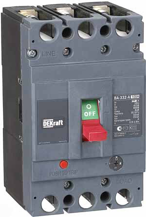 Автоматический выключатель серии ВА-332 DEKraft; 3P; номинальный ток 100 А, отключающая способность Icu = 50 кА (при 415 В 50 Гц); расцепитель and ndash; термомагнитный, регулируемый. В комплект поставки входят 4 межфазные перегородки и крепеж на монтажной плате. В дополнение к выключателям выпускается ряд аксессуаров, расширяющих их функционал: сигнальные контакты, расцепители напряжения, моторные приводы, шины выносные и др.