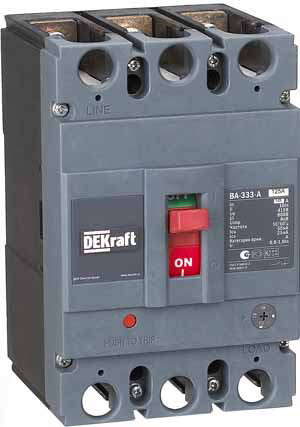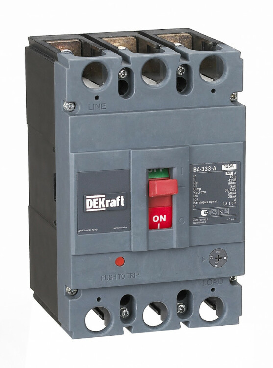 Автоматический выключатель серии ВА-333 Dekraft; 3P; номинальный ток 125 А, отключающая способность Icu = 50 кА (при 415 В 50 Гц); расцепитель – термомагнитный, регулируемый. В комплект поставки входят 4 межфазные перегородки и крепеж на монтажной плате. В дополнение к выключателям выпускается ряд аксессуаров, расширяющих их функционал: сигнальные контакты, расцепители напряжения, моторные приводы, шины выносные и др.