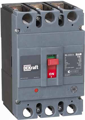 Автоматический выключатель серии ВА-333 Dekraft; 3P; номинальный ток 200 А, отключающая способность Icu = 50 кА (при 415 В 50 Гц); расцепитель – термомагнитный, регулируемый. В комплект поставки входят 4 межфазные перегородки и крепеж на монтажной плате. В дополнение к выключателям выпускается ряд аксессуаров, расширяющих их функционал: сигнальные контакты, расцепители напряжения, моторные приводы, шины выносные и др.