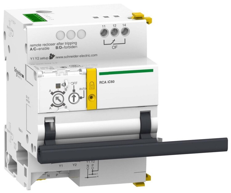 Acti 9 RCA мотор-редуктор для автоматов iC60 3P, 4P c интерфейсом Ti24. Мотор-редуктор RCA обеспечивает дистанционное электрическое управление (включение и отключение) автоматическими выключателями, возврат автоматического выключателя в исходное положение после срабатывания.Местное управление посредством рычага. Варианты действия после отключения: А: возможность дистанционного возвра та автоматического выключателя в исходное положение; Б: запрет дистанционного возврата в исходное положение.