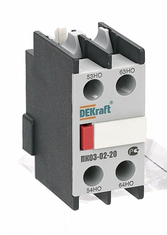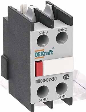 Приставка контактная серии ПК-03-02 для контакторов КМ-103 DEKraft; кол-во контактов - 2НО; ном.ток 10 А; ном.напряжение до 690 В; установка с лицевой стороны; степень защиты IP20. Приставки контактные предназначены для увеличения количества вспомогательных контактов контактора. Контактные приставки механически соединяются с контакторами и фиксируются при помощи защелки. Приставка подходит для использования с контакторами других производителей.
