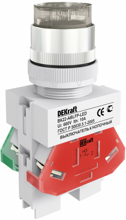 Выключатель кнопочный серии ВК-22 DEKraft; с выступающим толкателем; белый; с LED-индикацией; ном.ток 10 А; установка - на панели или двери; степень защиты - IP54; подключение - винтовыми зажимами. Выключатели кнопочные ВК-30 предназначены для коммутации электрических цепей и индикации состояния электрических цепей. Применяются в сетях переменного тока частотой 50/60 Гц с напряжением до 660В. Могут устанавливаться на подвижных и неподвижных частях стационарных установок.
