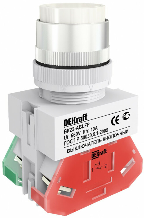Выключатель кнопочный серии ВК-22 DEKraft; с выступающим толкателем; белый; без индикации; ном.ток 10 А; установка - на панели или двери; степень защиты - IP54; подключение - винтовыми зажимами. Выключатели кнопочные ВК-22 предназначены для коммутации электрических цепей и индикации состояния электрических цепей. Применяются в сетях переменного тока частотой 50/60 Гц с напряжением до 660В. Могут устанавливаться на подвижных и неподвижных частях стационарных установок.