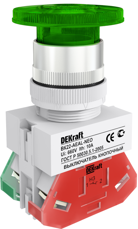 Выключатель кнопочный серии ВК-22 DEKraft; с грибовидным толкателем; зеленый; с неоновой лампой; ном.ток 10 А; установка - на панели или двери; степень защиты - IP54; подключение - винтовыми зажимами. Выключатели кнопочные ВК-22 предназначены для коммутации электрических цепей и индикации состояния электрических цепей. Применяются в сетях переменного тока частотой 50/60 Гц с напряжением до 660В. Могут устанавливаться на подвижных и неподвижных частях стационарных установок.
