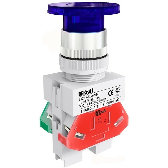 Выключатель кнопочный серии ВК-22 DEKraft; с грибовидным толкателем; синий; с неоновой лампой; ном.ток 10 А; установка - на панели или двери; степень защиты - IP54; подключение - винтовыми зажимами. Выключатели кнопочные ВК-22 предназначены для коммутации электрических цепей и индикации состояния электрических цепей. Применяются в сетях переменного тока частотой 50/60 Гц с напряжением до 660В. Могут устанавливаться на подвижных и неподвижных частях стационарных установок.