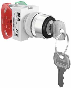 Переключатель серии ПЕ-22 Dekraft; исполнение - 3 фикс. положения (I-0-II); кол-во контактов – 2НО; замок с ключом; без индикации; ном.ток 10 А; установка - на панели или двери; степень защиты - IP54; подключение - винтовыми зажимами. Переключатели применяются для коммутации электрических цепей и индикации состояния устройств в сетях напряжением до 660В пер. тока. Могут устанавливаться на подвижных и неподвижных частях стационарных установок.