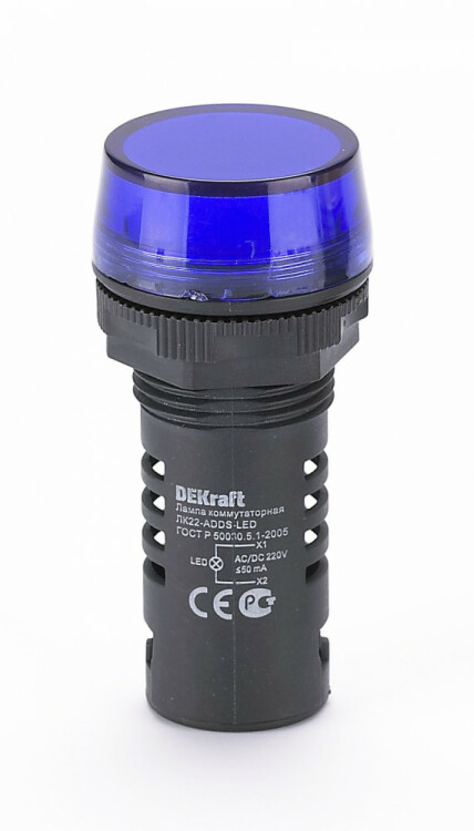 Лампа сигнальная ADDS серии ЛК-22 DEKraft; светодиодная; синяя; круглая; номинальное напряжение 220 В пер./пост.тока; установка - на панели или двери; степень защиты - IP54. Лампы сигнальные предназначены для индикации состояния электрических цепей и коммутационных аппаратов. Использование в лампах светодиодных матриц (LED) снижает потребление электроэнергии. Низкая чувствительность к колебаниям напряжения позволяет использовать их в электрических цепях с нестабильным напряжением.