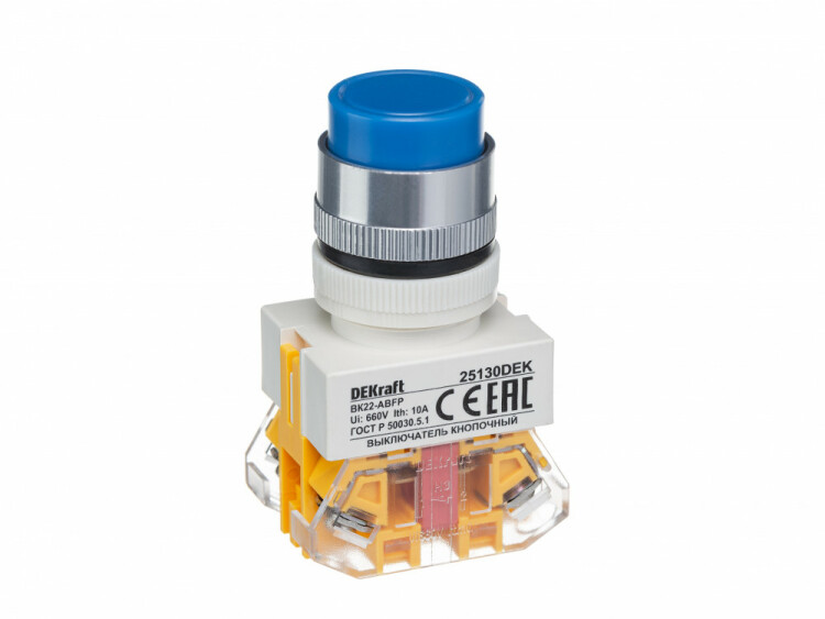 Выключатель кнопочный серии ВК-22 DEKraft; выступающий толкатель с фиксацией; синий; без индикации; ном.ток 10 А; установка - на панели или двери; степень защиты - IP54; подключение - винтовыми зажимами. Выключатели кнопочные ВК-22 предназначены для коммутации электрических цепей и индикации состояния электрических цепей. Применяются в сетях переменного тока частотой 50/60 Гц с напряжением до 660В. Могут устанавливаться на подвижных и неподвижных частях стационарных установок.