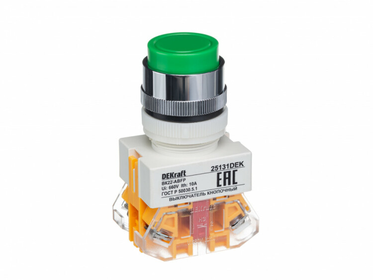Выключатель кнопочный серии ВК-22 DEKraft; выступающий толкатель с фиксацией; зеленый; без индикации; ном.ток 10 А; установка - на панели или двери; степень защиты - IP54; подключение - винтовыми зажимами. Выключатели кнопочные ВК-22 предназначены для коммутации электрических цепей и индикации состояния электрических цепей. Применяются в сетях переменного тока частотой 50/60 Гц с напряжением до 660В. Могут устанавливаться на подвижных и неподвижных частях стационарных установок.