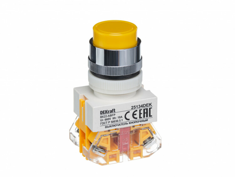Выключатель кнопочный серии ВК-22 DEKraft; выступающий толкатель с фиксацией; желтый; без индикации; ном.ток 10 А; установка - на панели или двери; степень защиты - IP54; подключение - винтовыми зажимами. Выключатели кнопочные ВК-22 предназначены для коммутации электрических цепей и индикации состояния электрических цепей. Применяются в сетях переменного тока частотой 50/60 Гц с напряжением до 660В. Могут устанавливаться на подвижных и неподвижных частях стационарных установок.