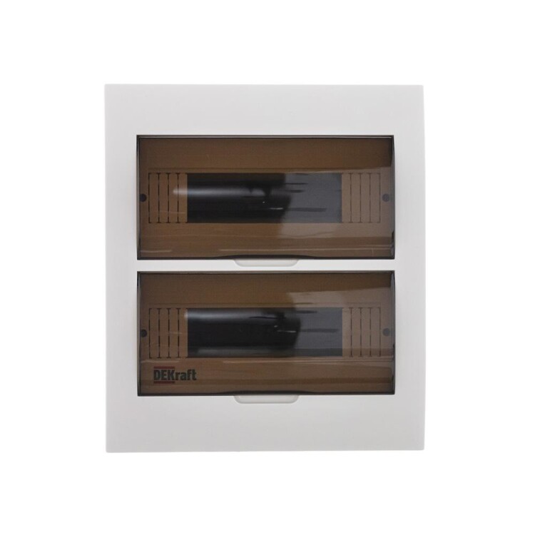 Корпус пластиковый встраиваемый серии ЩРВ-П IP41 RAL 9002 (светло-серый) используют для установки модульных устройств. Дизайн дверц корпуса имеет скругленные формы. Фронтальные части корпуса, дверцы, основание корпуса изготавливаются из самозатухающего ABS-пластика. Корпус имеет штампованные вводы для кабелей с разных сторон. Корпус является встраиваемым, имеет 2 черных DIN-рейки и 24 модулей (18 мм) для установки устройств, изолированные держатели для шинок, шинки N и PE. Дверцы на каждый ряд фиксируются в верхнем положении. Щиток на 100% совместим с модульным оборудованием Dekraft и Systeme Electric.