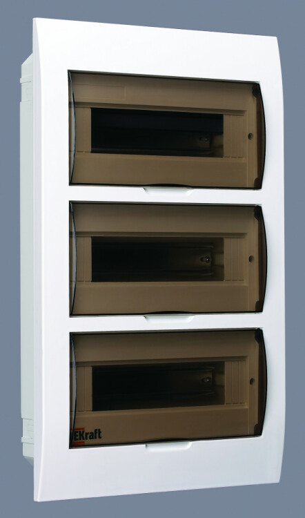 Корпус пластиковый встраиваемый серии ЩРВ-П IP41 RAL 9002 (светло-серый) используют для установки модульных устройств. Дизайн дверц корпуса имеет скругленные формы. Фронтальные части корпуса, дверцы, основание корпуса изготавливаются из самозатухающего ABS-пластика. Корпус имеет штампованные вводы для кабелей с разных сторон. Корпус является встраиваемым, имеет 3 черных DIN-рейки и 36 модулей (18 мм) для установки устройств, изолированные держатели для шинок, шинки N и PE. Дверцы на каждый ряд фиксируются в верхнем положении. Щиток на 100% совместим с модульным оборудованием Dekraft и Systeme Electric.