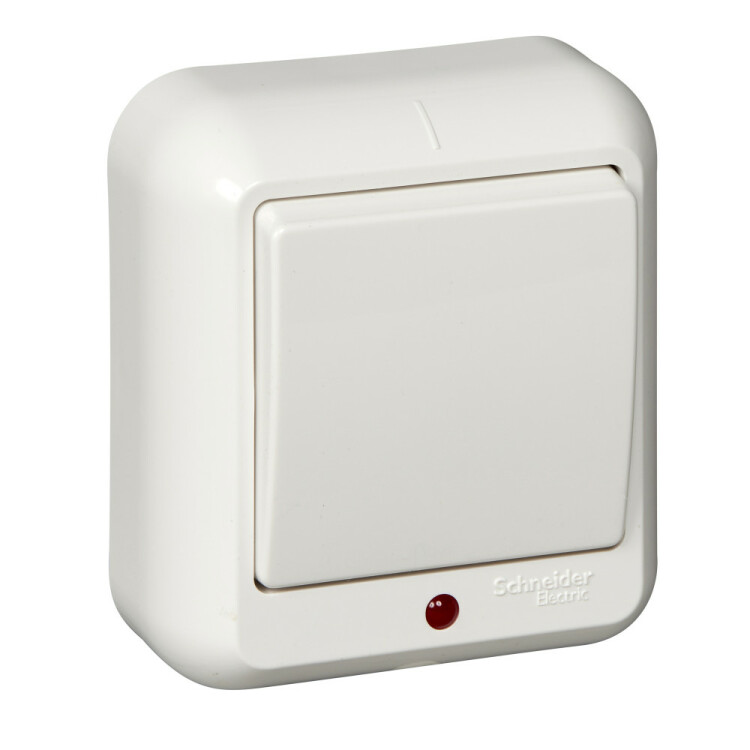 Выключатель одноклавишный Schneider Electric ПРИМА (открытой установки, цвет слоновая кость) с подсветкой и с изолирующей пластиковой пластиной предназначен для сетей до 250 В, на ток до 6 А.