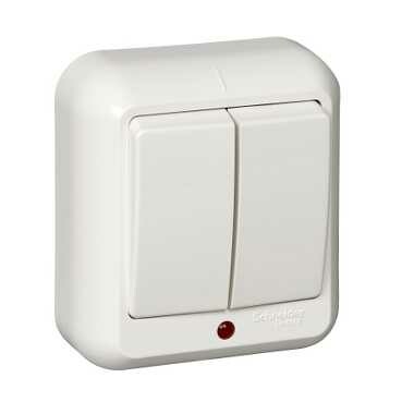 Выключатель двухклавишный Schneider Electric ПРИМА (открытой установки, цвет белый) с подсветкой предназначен для сетей до 250 В, на ток до 10 А.