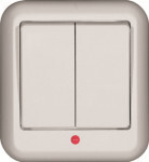 Выключатель двухклавишный Schneider Electric ПРИМА (открытой установки, цвет белый) с подсветкой предназначен для сетей до 250 В, на ток до 6 А.