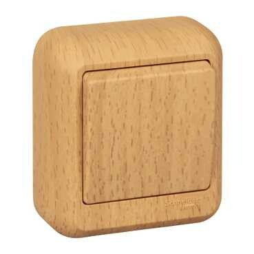 Выключатель одноклавишный Schneider Electric ПРИМА (открытая установка, бук) с изолирующей пластиковой пластиной предназначен для сетей до 250 В, на ток до 10 А.