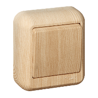 Выключатель одноклавишный Schneider Electric ПРИМА (открытая установка, сосна) с изолирующей пластиковой пластиной предназначен для сетей до 250 В, на ток до 10 А.