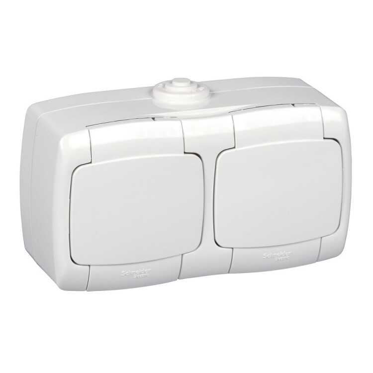 Розетка Schneider Electric РОНДО (открытой установки, цвет белый) двойная с заземлением со шторками предназначена для сетей до 250 В на ток до 16 А.