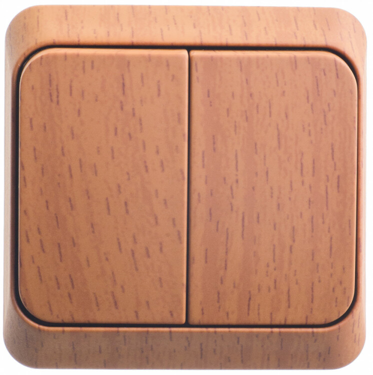 Выключатель Systeme Electric (ранее Schneider Electric) ЭТЮД (бук, открытой установки) двухклавишный предназначен для применения в сетях до 250В, на ток до 10А. Наличие подсветки делает его легко находимым при отсутствии освещения. Две клавиши позволяют управлять двумя источниками света с одной точки. Изделия цвета Бук обладают уникальным рисунком, напоминающим древесный сруб. Сделано в России.