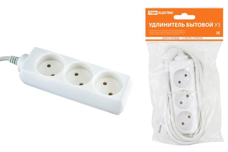 Удлинитель бытовой У3 3 гнезда, 1,5метра, без заземления, ПВС 2х0,75 мм2 10А/250В TDM (кр.1шт)