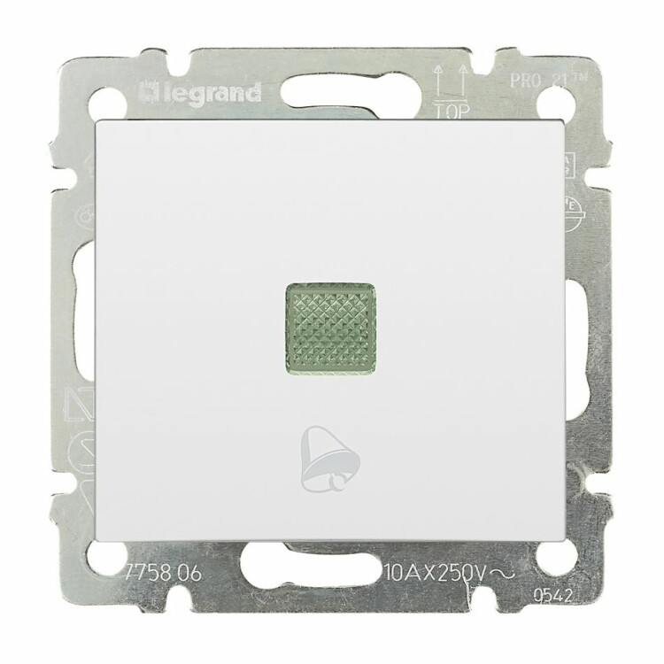 Выключатель кнопочный одноклавишный с подсветкой с символом звонка - Legrand Valena - 10А 250В схема 1PL безвинтовые зажимы - белый