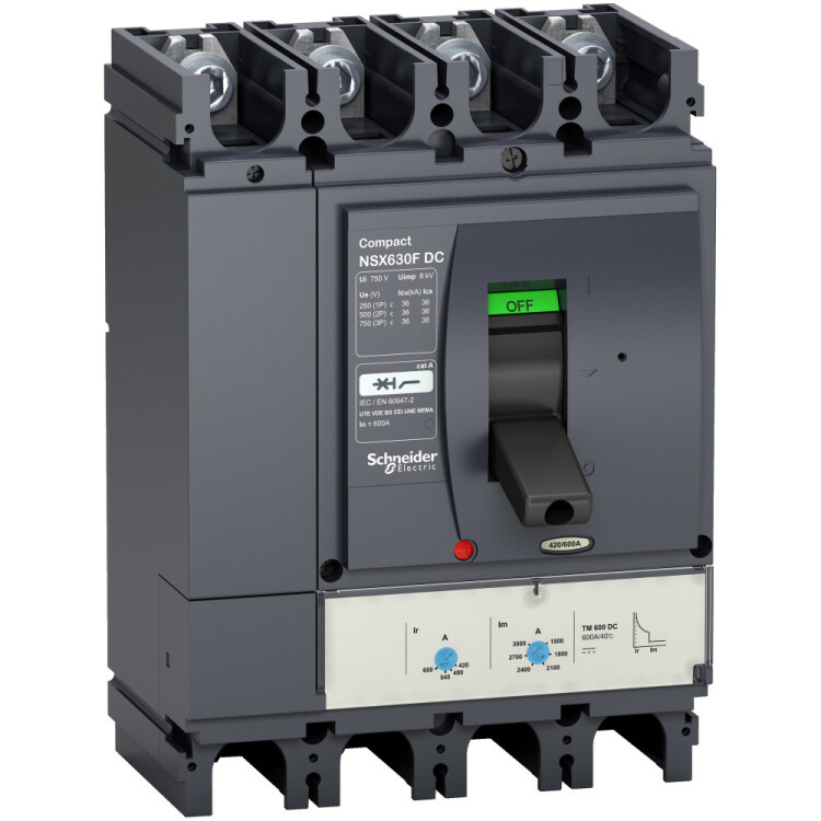 Автоматический выклю чатель ComPact NSX400F Schneider Electric, 4-полюсный; номинальный ток 250 А; Icu = 36 кА 250 В пост. тока; Ics=100% Icu; с термомагнитным расцепителем TM-D; ШхВхГ – 200x291x147 мм; исполнение – стационарный; монтаж - на DIN-рейке или плате.