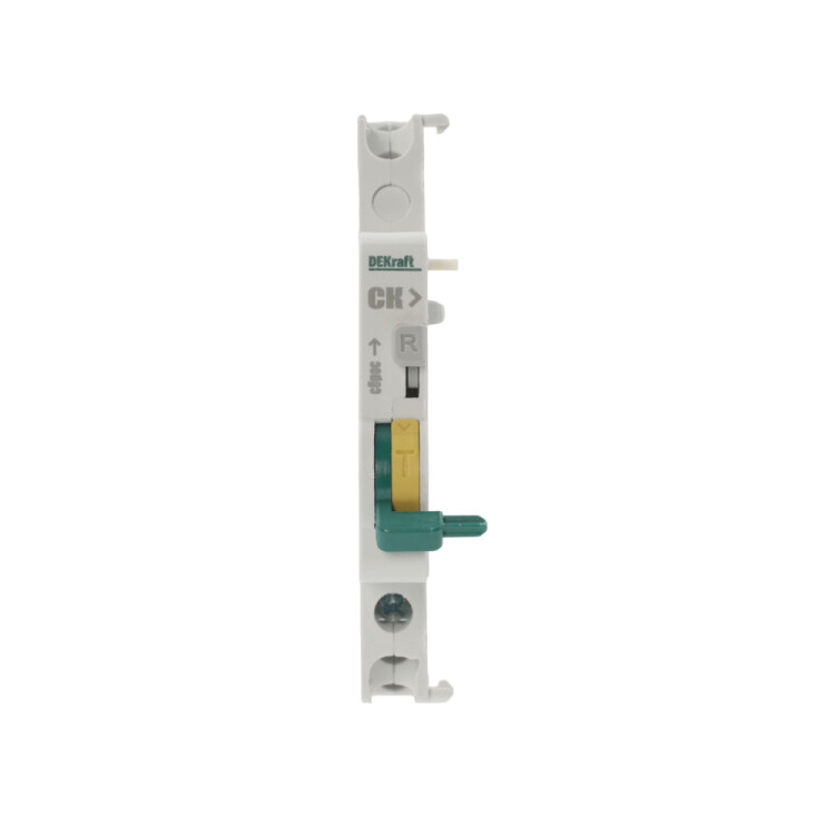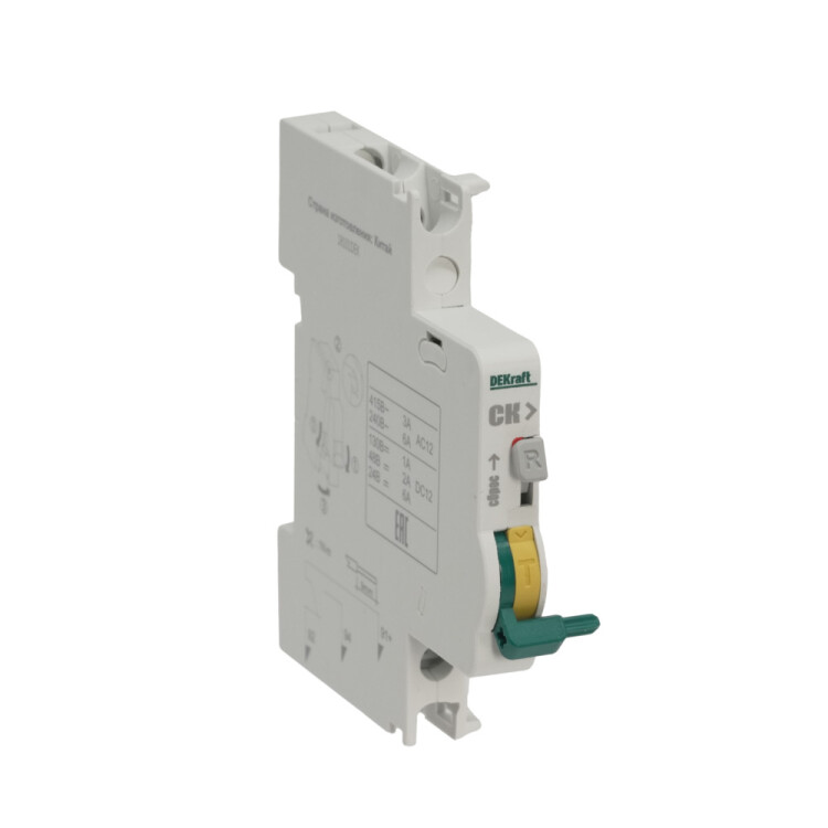 Контакт сигнальный СК-101 для автоматических выключателей серии ВА-101 DEKraft; предназначен для сигнализации аварийного срабатывания выключателя; тип контакта переключающий; ширина 9 мм; присоединение к выключателю слева.