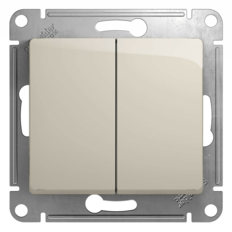 Механизм Systeme Electric (ранее Schneider Electric) серии Glossa (цвет молочный) переключателя 2-клавишного подходит для сетей 250 В, на ток 10 А. Переключатель позволяет управлять одним источником света с двух точек. Выполнен из материала PС+ASA, стойкого к УФ-излучению и появлению царапин. Эргономичные клеммы расположены в два ряда: сверху и снизу.