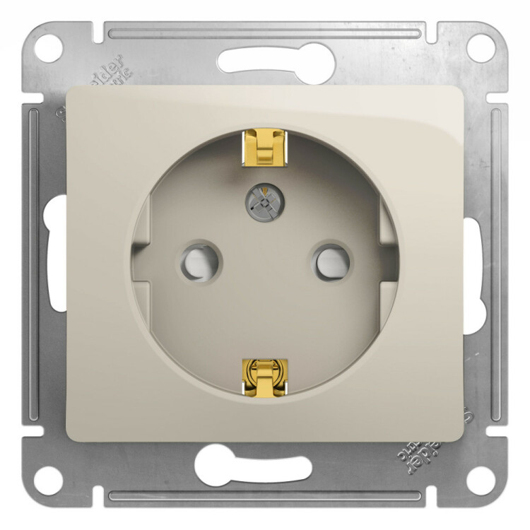 Механизм Systeme Electric (ранее Schneider Electric) серии Glossa (цвет молочный) розетки одинарной с заземлением и шторк ами подходит для сетей 250 В, на ток 16 А. Заземляющий контакт обеспечивает дополнительную защиту от удара электрическим током. При наличии заземления электрический потенциал уходит в землю, защищая человека. Выполнен из материала PС+ASA, стойкого к УФ-излучению и появлению царапин. Эргономичные клеммы розеток расположены в один ряд.