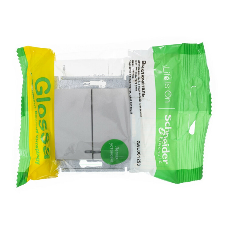 Механизм Systeme Electric (ранее Schneider Electric) серии Glossa (цвет платина) выключателя 2-клавишного с подсветкой подходит для сетей 250 В, на ток 10 А. Благодаря современной светодиодной подсветке зеленого цвета изделие легко найти в темноте. Двухклавишный выключатель позволяет управлять двумя источниками света с одной точки. Выполнен из материала PС+ASA, стойкого к УФ-излучению и появлению царапин. Эргономичные клеммы расположены в два ряда: сверху и снизу.