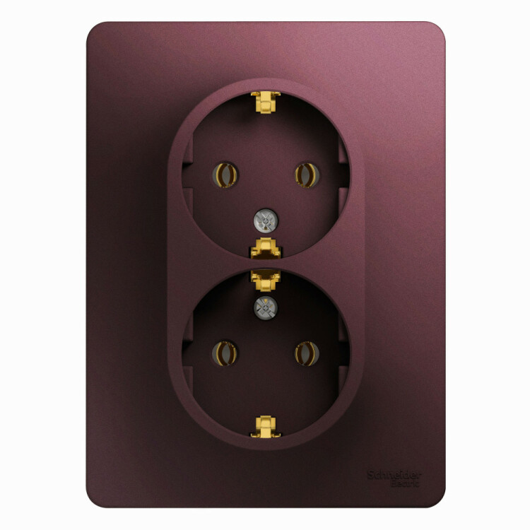 Розетка двойная Systeme Electric (ранее Schneider Electric) серии Glossa (в сборе, цвет баклажановый) с заземлением, без шторок подходит для сетей 250 В, на ток 16 А.