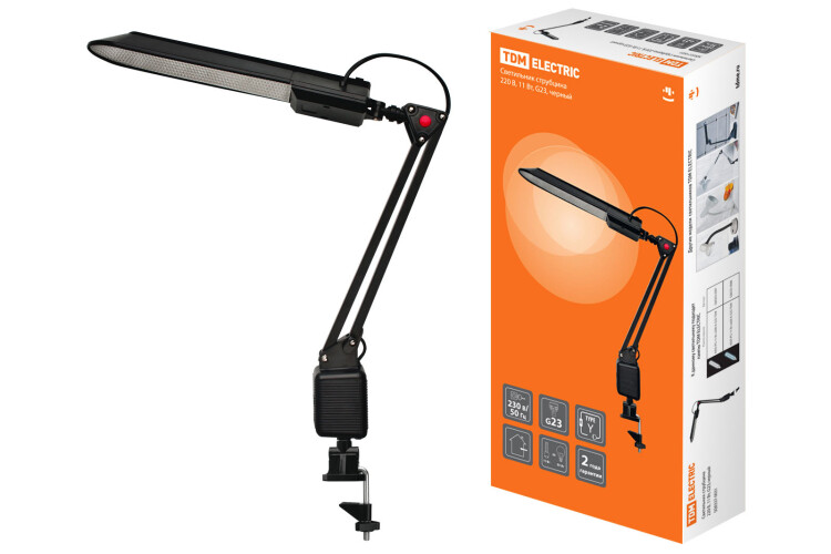 Назначение:br/Предназначены для местного освещения рабочего пространства.br/Преимущества:br/Современный стильный дизайн.Длительный срок службы светильника.Надежное крепление струбцина для установки светильника к краю стола.Лёгкая подвижная конструкция позволяет располагать светильник под любым углом.Регулировка наклона и поворота плафона светильника.Отражатель светильника обеспечивает равномерное освещение поверхности.Комфортный мягкий свет, отсутствие негативного влияния на глаза человека (в моделях, укомплектованных люминесцентной лампой).Отсутствие нагрева светильника.br/Конструкция:br/Выключатель на плафоне (в зависимости от модели).br/Материалы:br/Негорючие и нетоксичные материалыПлафон:МеталлЭмальАБС-пластикПатрон:Керамикаbr/Упаковка:br/Коробка из картонаbr/