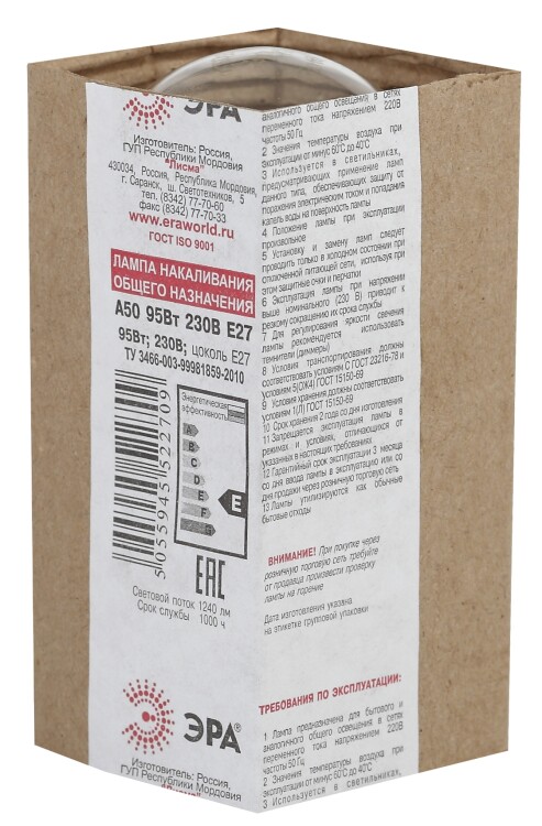 Лампа накаливания ЭРА А50 95Вт 230-240V Е27 лон, прозр. в гофре, Б 230-95-4 (154/3696) | Б0017695