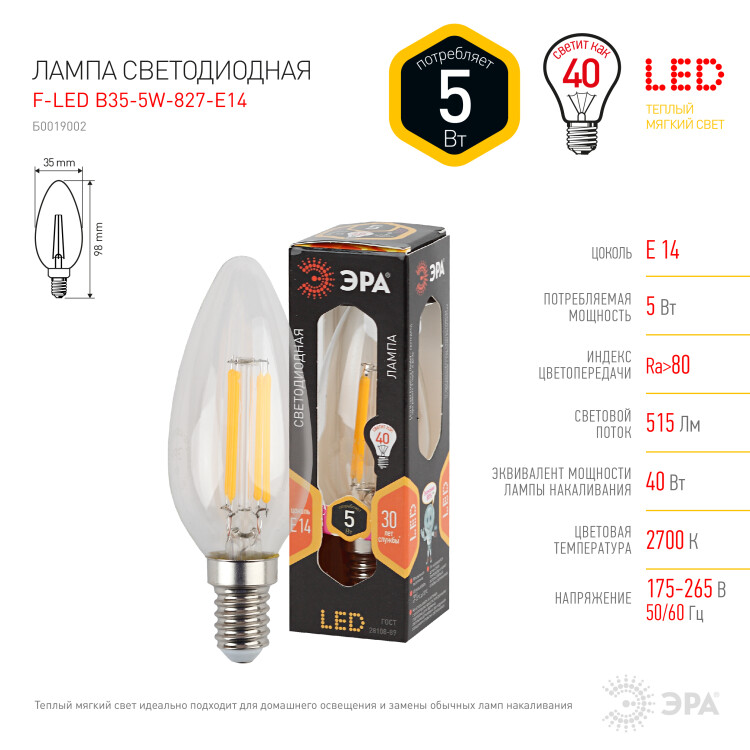 Лампочка светодиодная ЭРА F-LED B35-5W-827-E14 Е14 / Е14 5Вт филамент свеча теплый белый свeт (кр. 1шт )