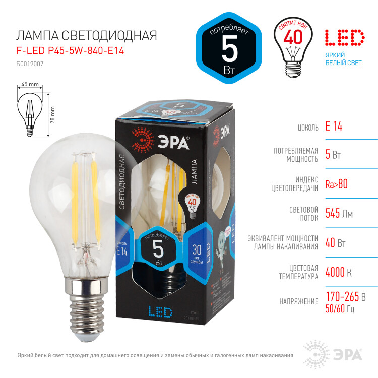 Лампочка светодиодная ЭРА F-LED P45-5W-840-E14 Е14 / Е14 5Вт филамент шар нейтральный белый свет (кр. 1шт)
