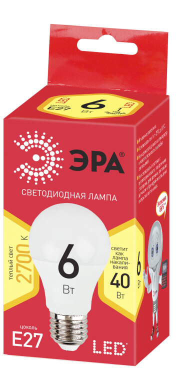 *Лампа светодиодная ECO LED A60-6W-827-E27 ЭРА (диод, груша, 6Вт, тепл, E27) (10/100/1200)