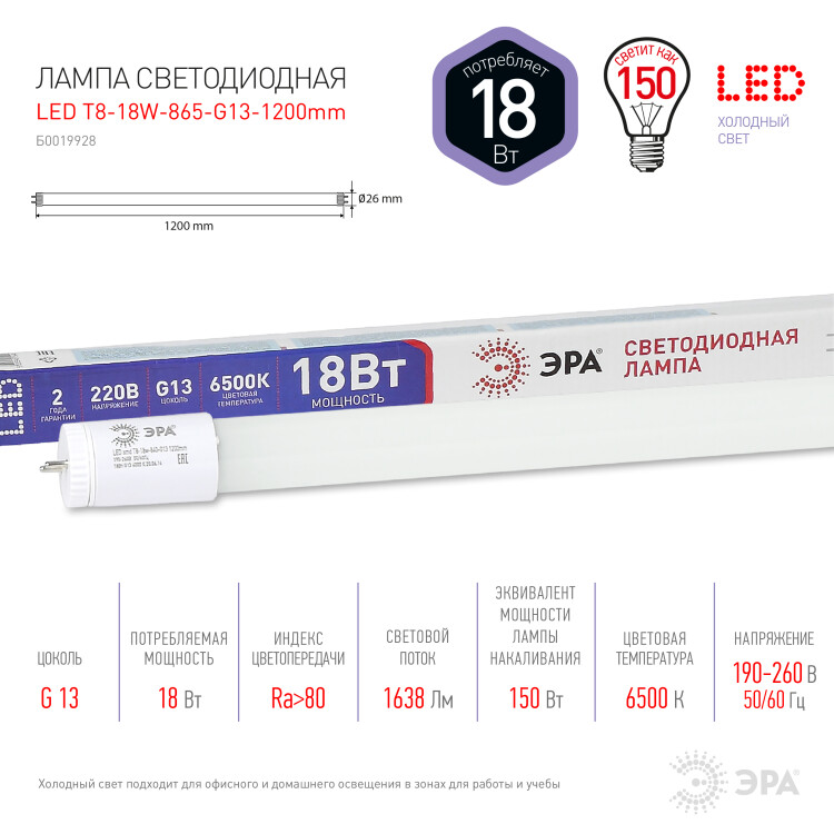 Светодиодные энергосберегающие лампы ЭРА Серии Стандарт общего освещения повторяют форму и размеры стандартных линейных люминесцентных ламп Т8. Идеально подходят к любому светильнику, в котором используются данные типы ламп.