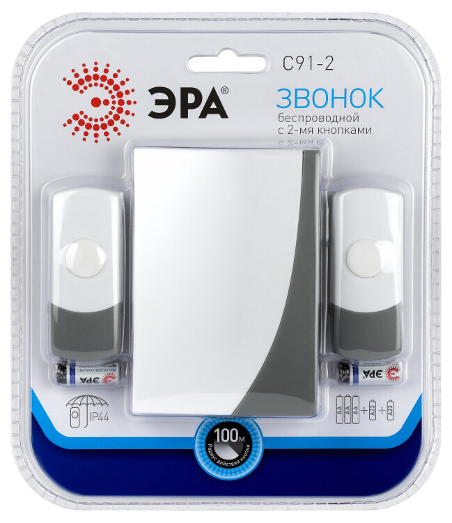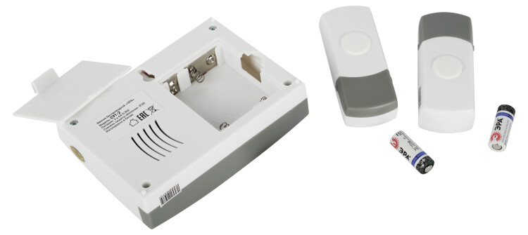 Беспроводной электрический дверной звонок с двумя кнопками, защищёнными от влаги и пыли. Отличное решение для дачи или загородного дома, когда на территорию есть разные входы. Для каждой кнопки своя полифоническая мелодия. Звонок работает от батареек: 1 шт А23 для кнопки (входит в комплект), 2 шт АА пальчиковые для динамика (в комплект не входят). Аккуратный бело-серый дизайн актуален для любого интерьера. Приятная упаковка делает данный звонок хорошим подарком на новоселье и другие праздники.