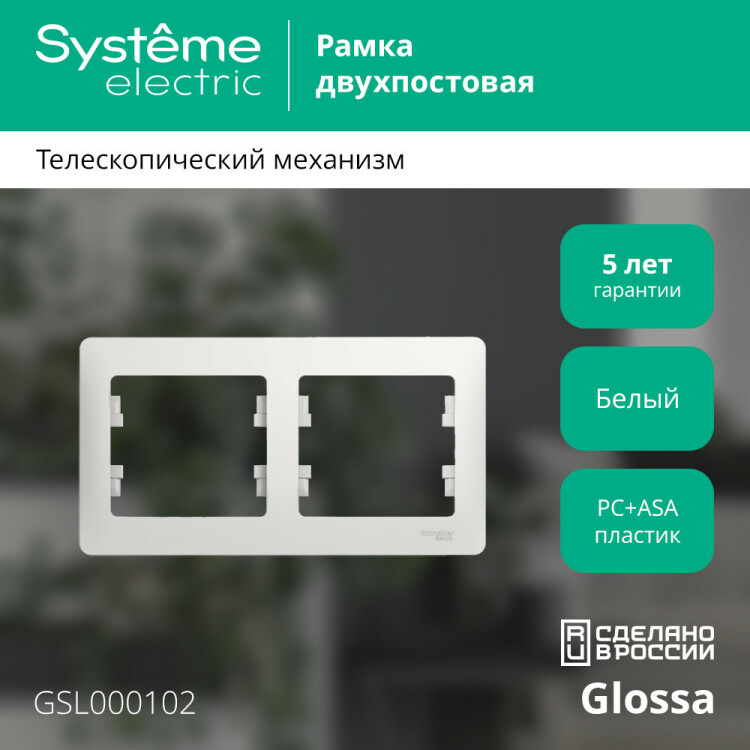 Рамка Systeme Electric (ранее Schneider Electric) серии Glossa (цвет белый) двухместная. Устанавливается в горизонтальном положении. Выполнена из материала PС+ASA, стойкого к УФ-излучению и появлению царапин. Позволяет гармонично вписать электроустановочное изделие в интерьер помещения. (ранее Schneider Electric ЭУИ UNICA, ЭУИ UNICA NEW MGU2.004.18, NU200418)
