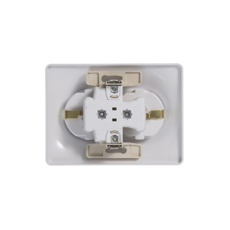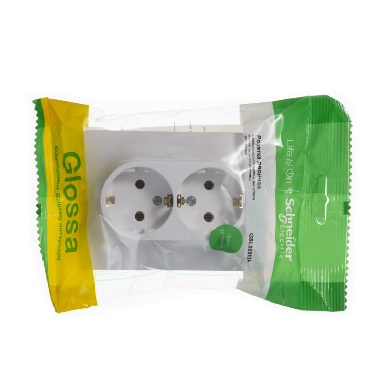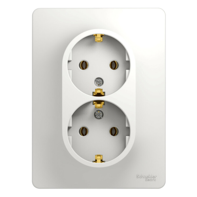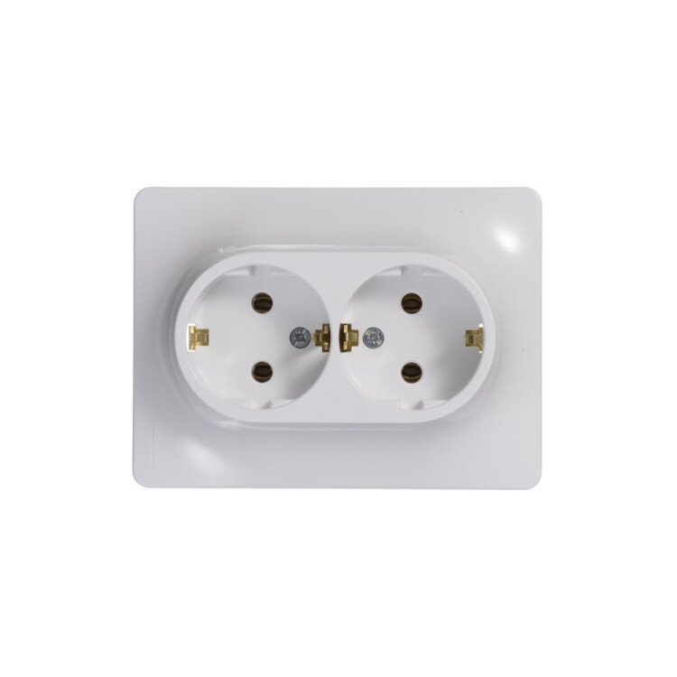 Розетка двойная Systeme Electric (ранее Schneider Electric) серии Glossa (в сборе, цвет белый) с заземлением, без шторок по дходит для сетей 250 В, на ток 16 А. Заземляющий контакт обеспечивает дополнительную защиту от удара электрическим током. При наличии заземления электрический потенциал уходит в землю, защищая человека. Выполнен из материала PС+ASA, стойкого к УФ-излучению и появлению царапин. Двойная розетка позволяет подключить два устройства в одном месте.