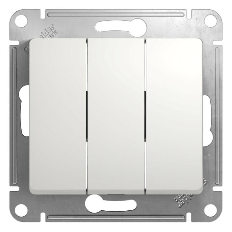 Механизм Systeme Electric (ранее Schneider Electric) серии Glossa (цвет белый) выключателя 3-клавишного подходит для сетей 250 В, на ток 10 А. Трёхклавишный выключатель позволяет управлять тремя источниками света из одной точки. Выполнен из материала PС+ASA, стойкого к УФ-излучению и появлению царапин. Эргономичные клеммы расположены в два ряда: сверху и снизу.