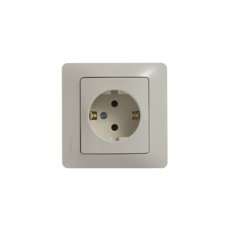 Розетка Systeme Electric (ранее Schneider Electric) серии Glossa (в сборе, цвет бежевый) одинарная с заземлением, без шторок подходит для сетей 250 В, на ток 16 А. Выполнен из материала PС+ASA, стойкого к УФ-излучению и появлению царапин. Эргономичные клеммы розеток расположены в один ряд.